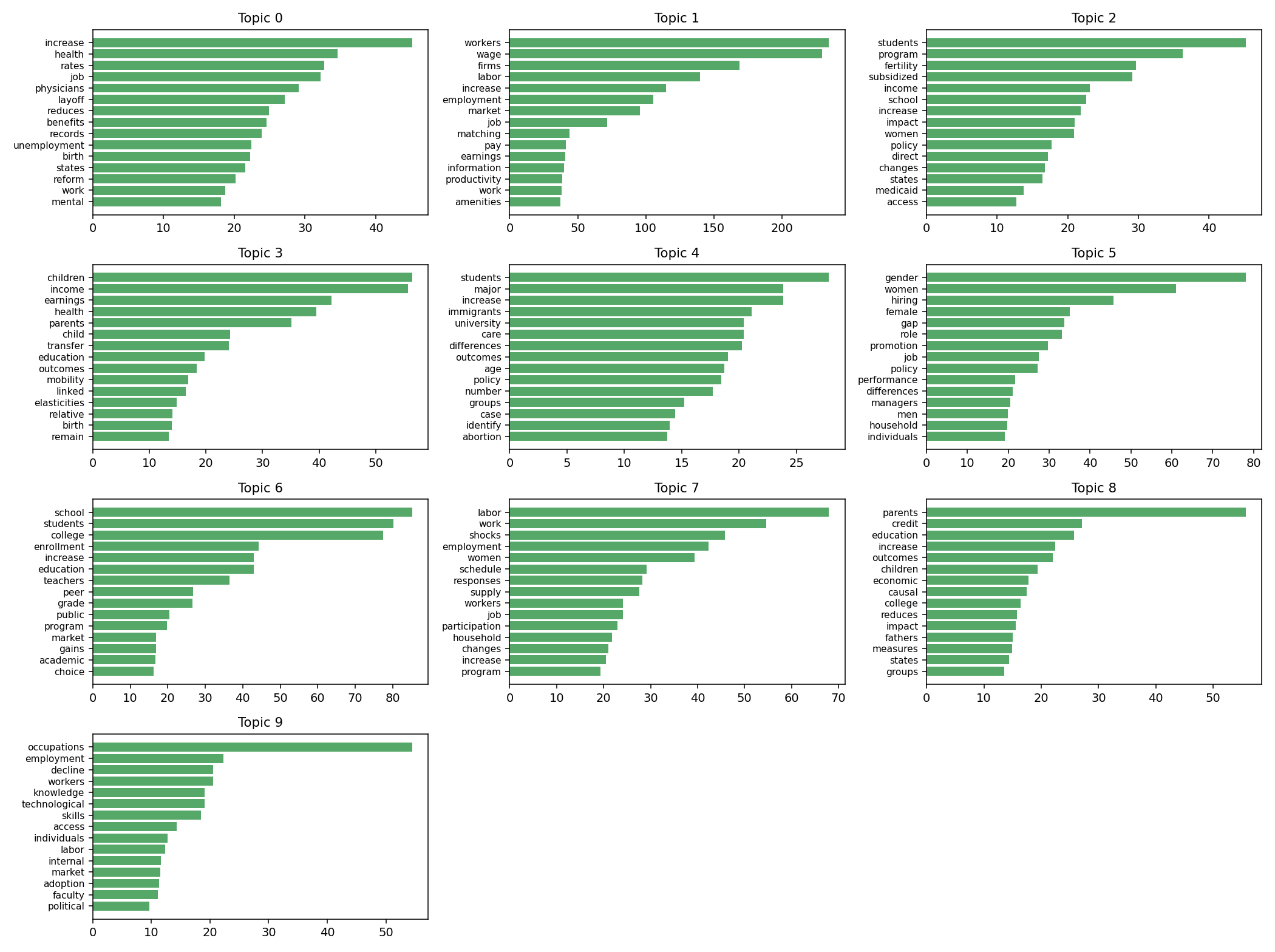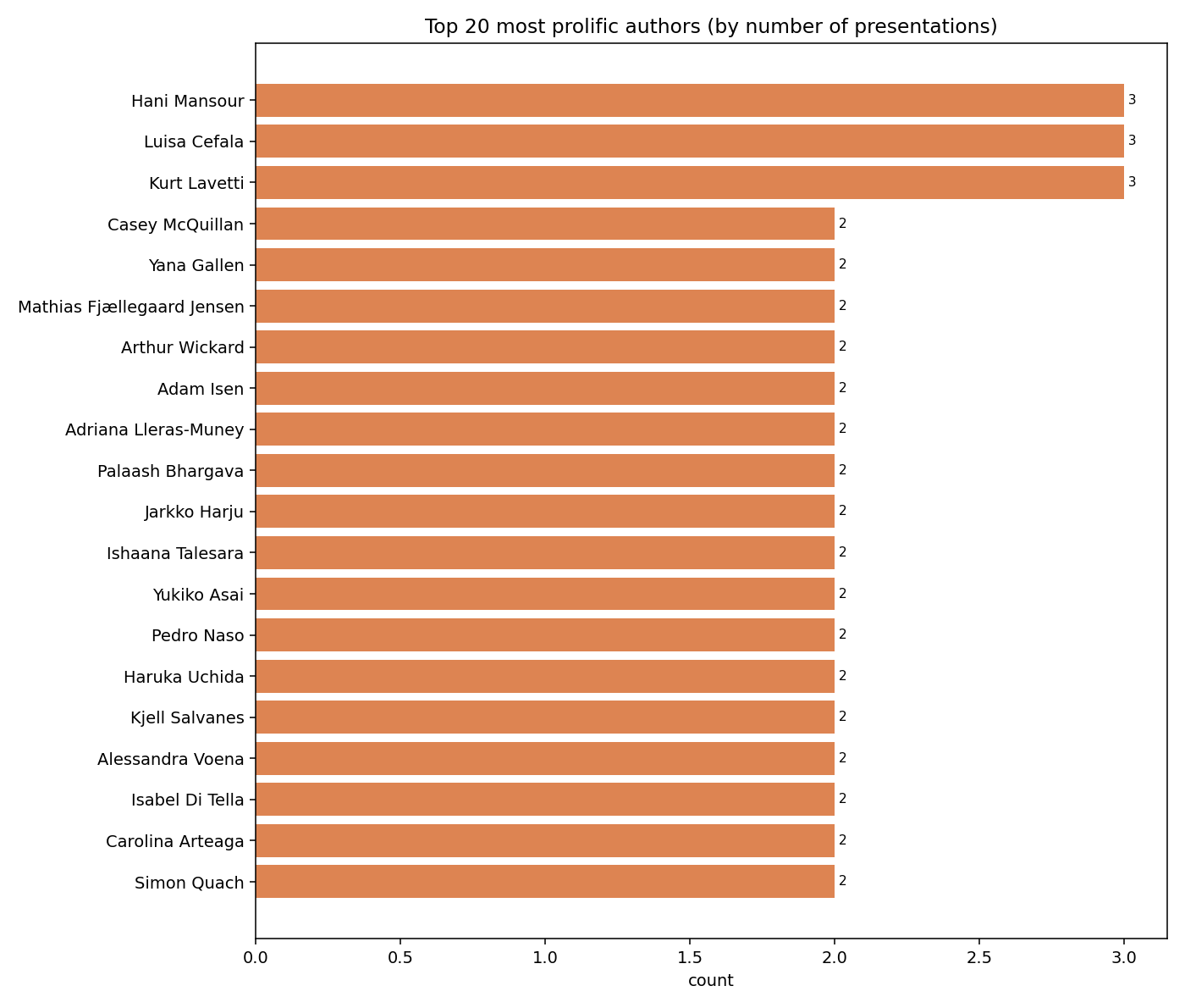 Going one level deeper, I fit a Latent Dirichlet Allocation (LDA) topic model on the abstracts to group papers into latent topics. The top words for each topic give a sense of what clusters of research are being presented.