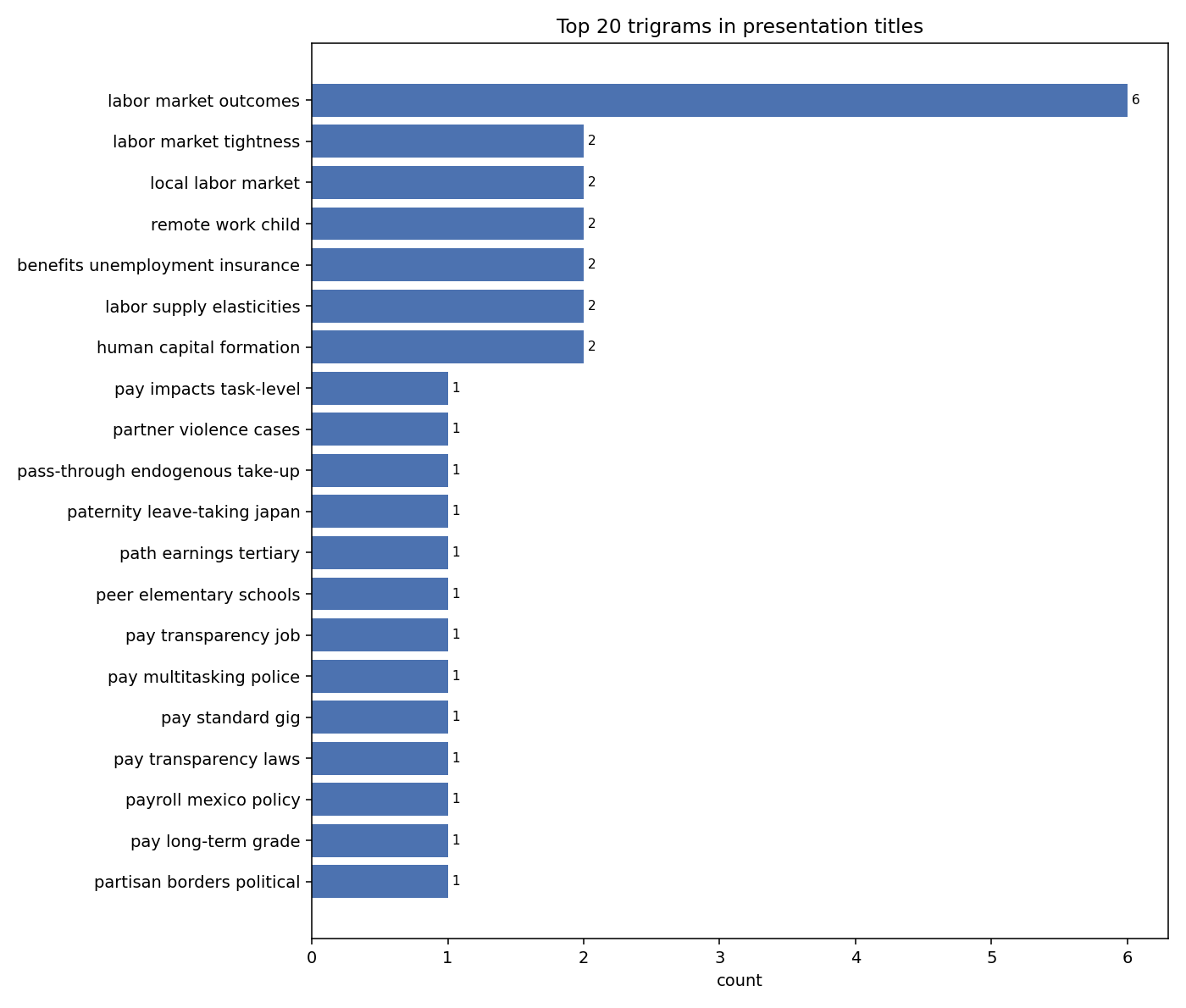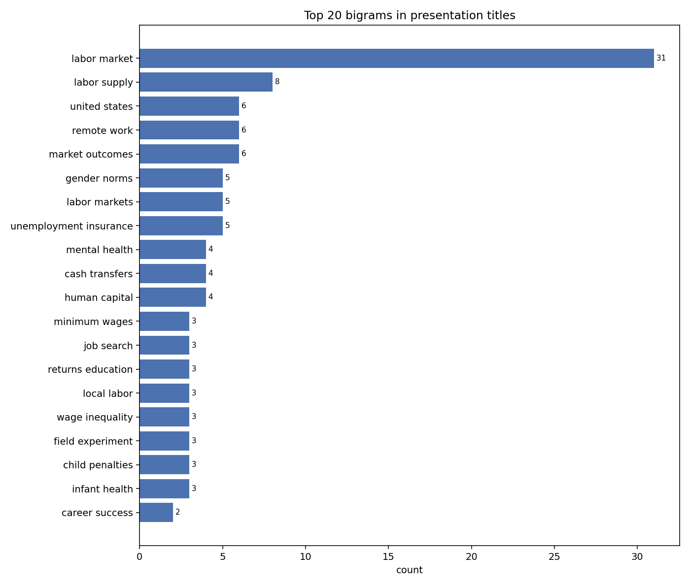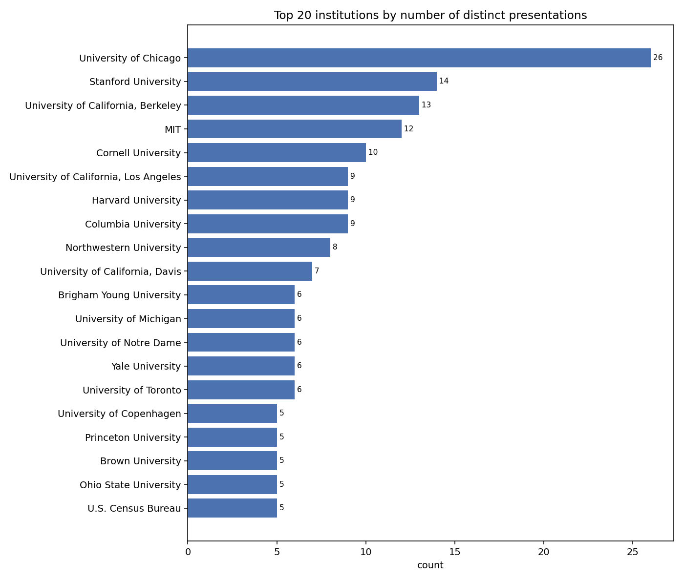 Affiliations are dominated by the usual suspects in labor economics. The top 20 institutions represented in the program: